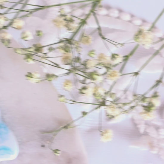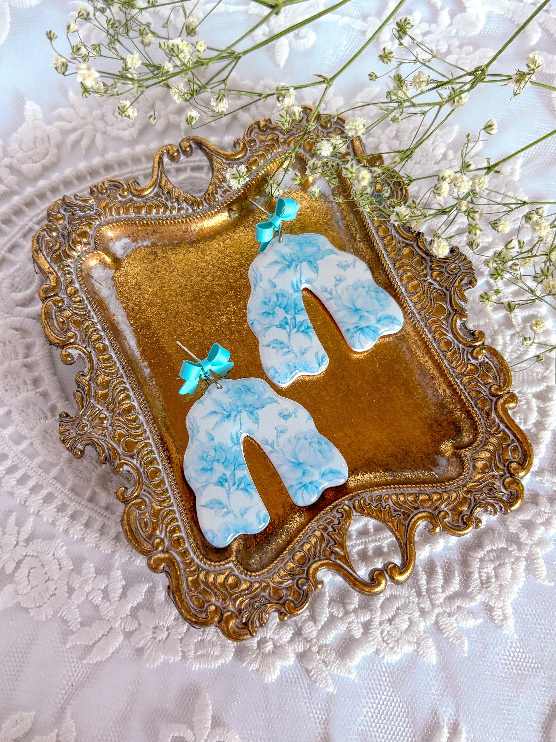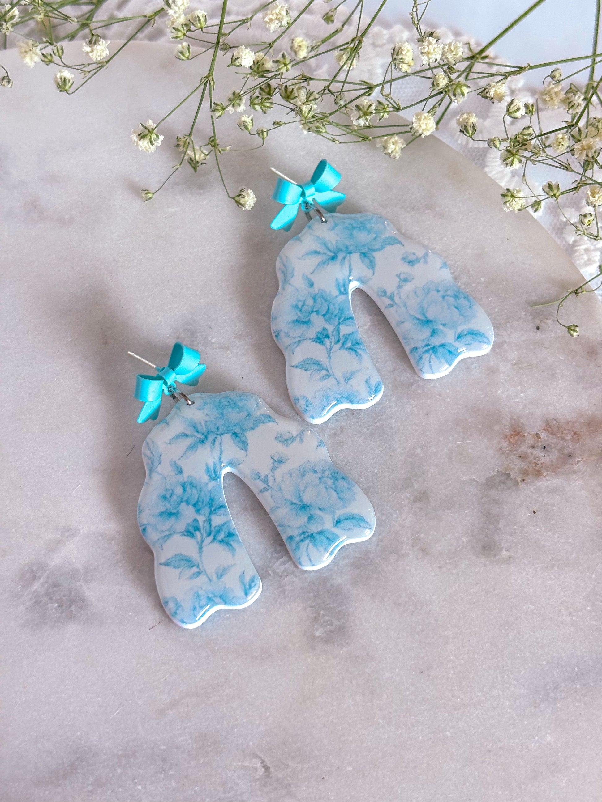 Earrings are made with stainless steel jump rings and light blue bow studs backings.